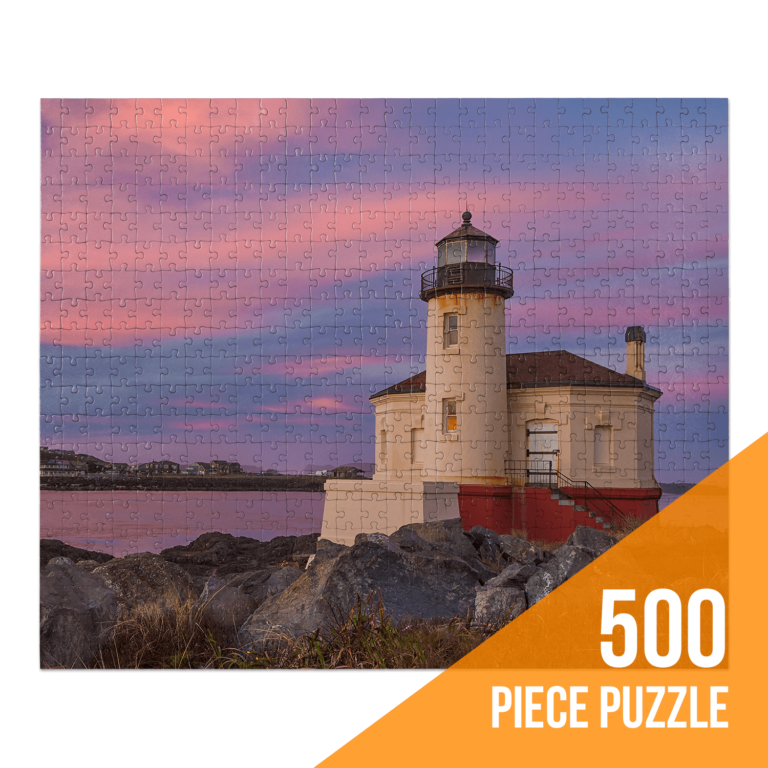 This 500-piece puzzle features a stunning sunrise at Coquille River Lighthouse near Bandon.